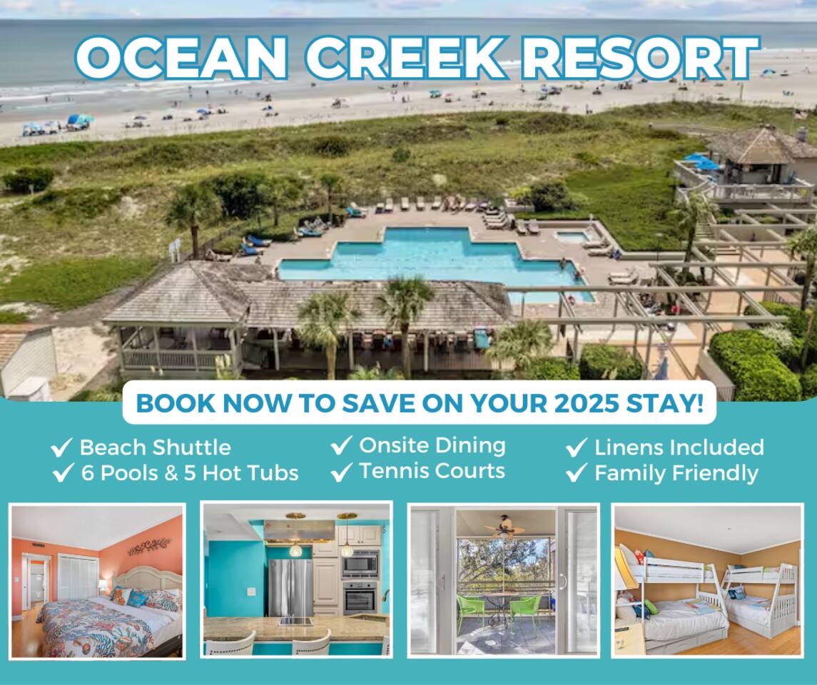 Welcome to your bright and spacious 2BR, 2BA condo at Ocean Creek Resort! Enjoy six outdoor pools, an indoor pool, hot tub, tennis courts, and private beach access. Relax with concierge services, free parking, and meals at the poolside grill. Located just across from Barefoot Landing, you'll have shops, dining, and entertainment at your doorstep. Perfect for family fun or a relaxing beach getaway!