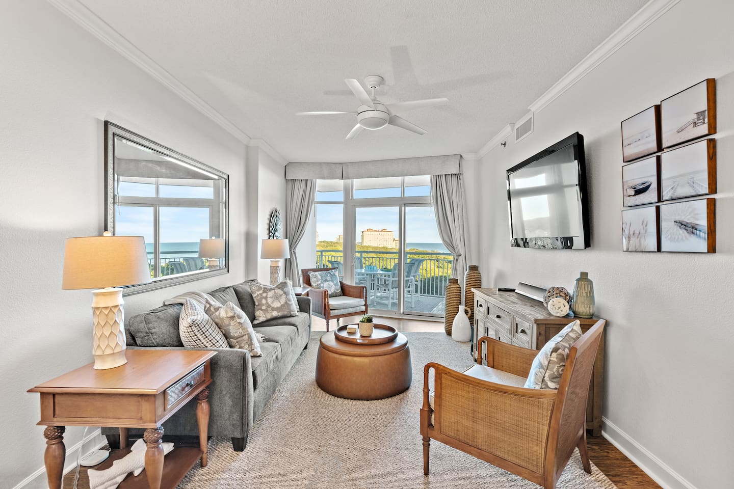 Step into this spacious 5th-floor condo, perched above four levels of covered parking, with stunning views of both the ocean and inland scenery. Perfect for families or groups, this upscale two-bedroom retreat combines comfort, convenience, and premium amenities. Bedrooms & Baths: • Master suite with a king bed and en-suite bathroom • 2nd bedrooms with two queen beds and a full bath. Living Areas: • Open living and dining area with 9-foot ceilings, flooded with natural light • Balcony accessible from both the master bedroom and living room, offering breathtaking ocean views from every window Kitchen: Fully equipped for all your cooking needs. Premium Amenities: • Water fun galore: indoor & outdoor pools, indoor & outdoor spas, hot tub and an outdoor lazy river • Outdoor lounge: rooftop seating with fire pit, perfect for relaxing evenings • On-site gym to keep up your fitness routine. • In-unit laundry for convenience during longer stays. • Steps from the beach for sun, sand, and surf Nearby Activities: • Located in an upscale area on the north end of Myrtle Beach • Walking distance to numerous shops and restaurants • Just minutes by car to Barefoot Landing, Broadway at the Beach, Restaurant Row, and the Myrtle Beach Boardwalk • Golf, shopping, local dining, and popular attractions all within easy reach Whether it’s a weekend getaway or an extended vacation, every day here feels like a true coastal escape.