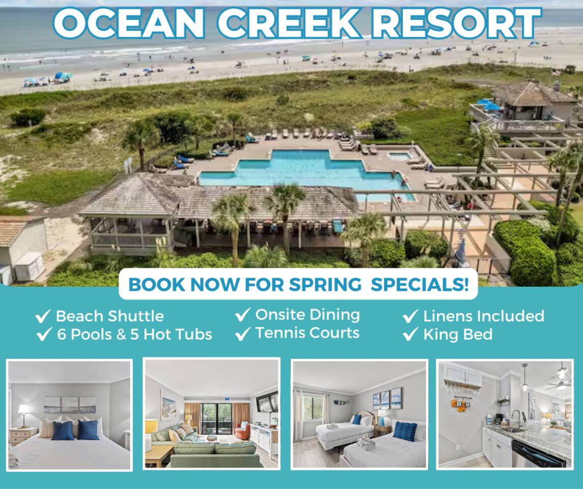 Welcome to Ocean Creek Plantation Resort! This spacious 2-bed, 2-bath condo is just steps from the beach, perfect for your next getaway. Enjoy a full kitchen, comfy living room, and private balcony for morning coffee. Resort perks include pools, a lazy river, tennis courts, fitness center, and a free beach shuttle. Plus, you're just minutes from Barefoot Landing’s shops and dining. Everything you need for a perfect Myrtle Beach vacation is right here!