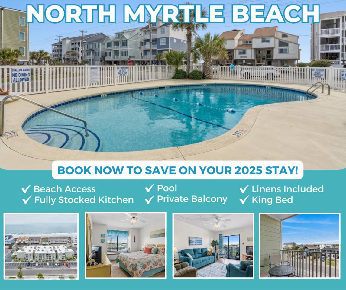 Key Features: A short walk across the street takes you to the sandy shores of North Myrtle Beach! Fully Equipped Kitchen: Prepare delicious meals in the full kitchen, complete with all the essentials you need. Private Balcony: Sip your morning coffee or enjoy a glass of wine at sunset on the balcony. Master Suite: Relax in the comfortable king-sized bed of the master bedroom, complete with an en-suite bathroom. Second Bedroom: The second bedroom features a comfortable queen bed. Living Space: A pull-out sofa provides additional sleeping accommodations! Amenities: You'll have access to all the amenities you need so you can pack light, including: Shampoo, conditioner, soap, toothbrush, toilet paper, paper towels, trash bags, tissues, dishwasher pods, laundry sheets, and more! *All linens included - bath towel sets, clean white linens on beds with crisp & freshly laundered duvet bedding, and beach towels Free parking (2 spots) Wi-Fi TVs in every room Washer and dryer on premises Keurig coffee maker Location: Our condo is ideally situated in the heart of North Myrtle Beach, providing easy access to a wide range of activities and attractions. Enjoy the beach, dine at delicious local restaurants, shop at nearby boutiques, and enjoy exciting water sports and golfing! Book your stay today and start counting down the days until you can sink your toes into the sand and soak up the sun!