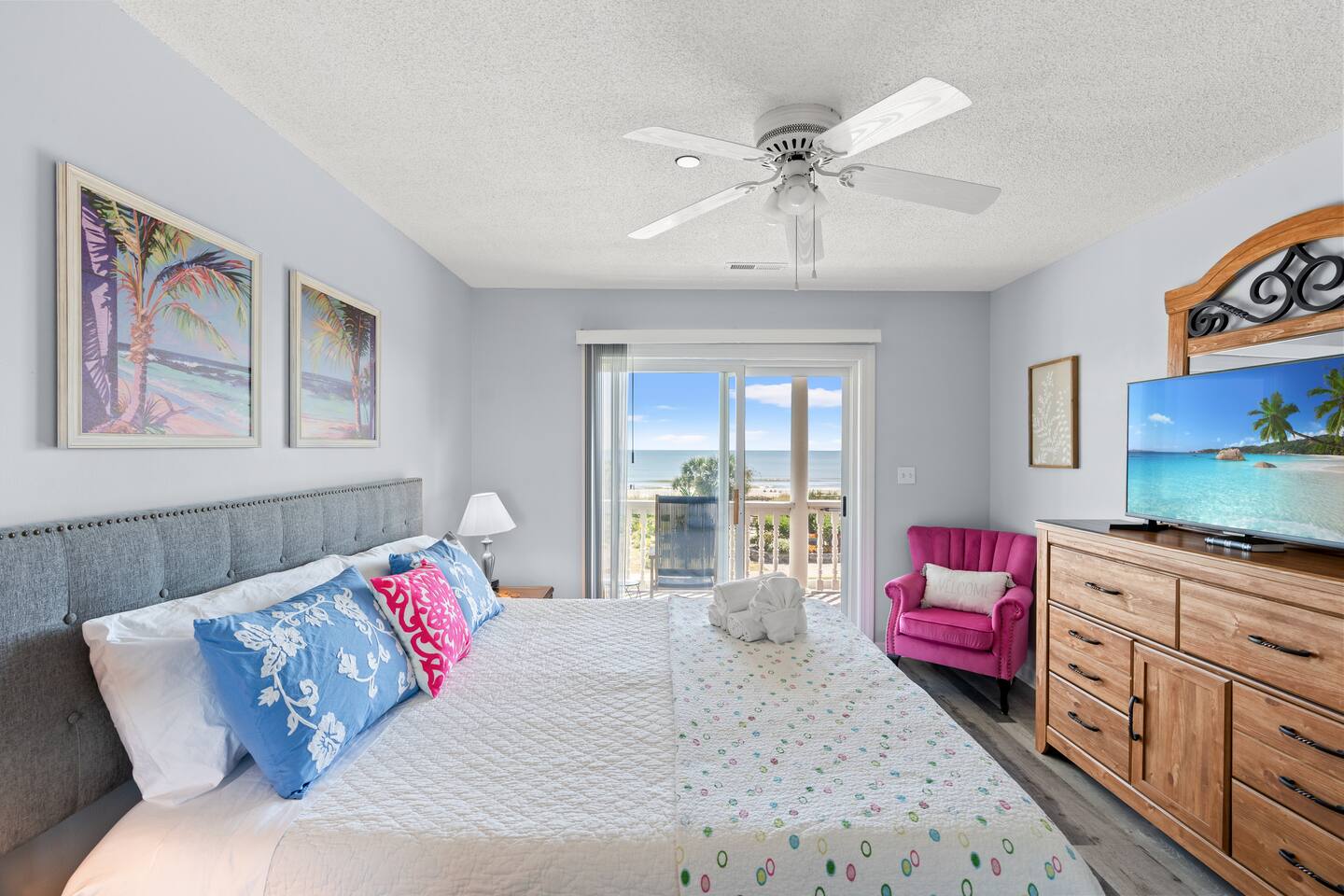 Discover the beauty of Myrtle Beach's Golden Mile w/this delightful 3bedroom 2bath, 2nd floor unit, Drayton House #201 comfortably accommodates 6 guests. Living rm master & dining provide direct oceanfront views large private balcony w/charming 2 seat wooden swing & patio furniture windows ocean breezes & ocean views from every bedroom! Steps to beach w/lifeguard station in view, beach chairs, boogie boards & beach toys provided. Grill stations, small park for kids w/swings & play across street.
